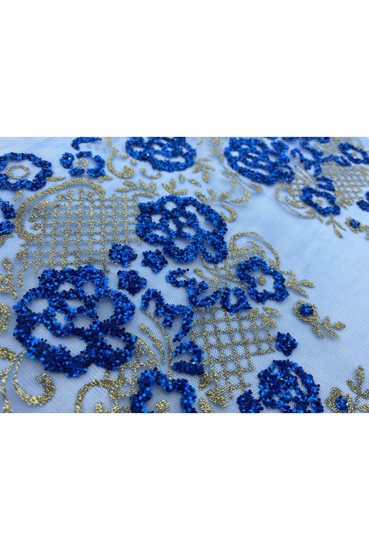Krem iplik ve indigo zemin uyumuyla şifon üzeri polyester brode, zarif projeler için idealdir.-14977..