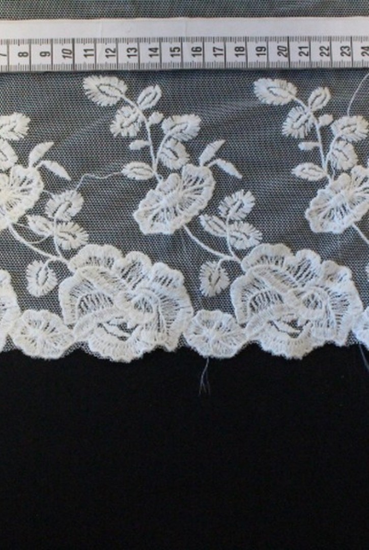 Gül desenli ve parlak polyesterden yapılan brode bant, 21 cm genişliğinde ve zarif bir tasarım sunar..