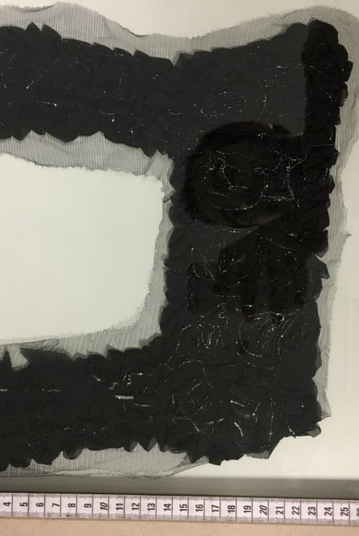 Etamin zemin üzerine kırmızı, pembe ve yeşil nakış detaylı polyester aplik...