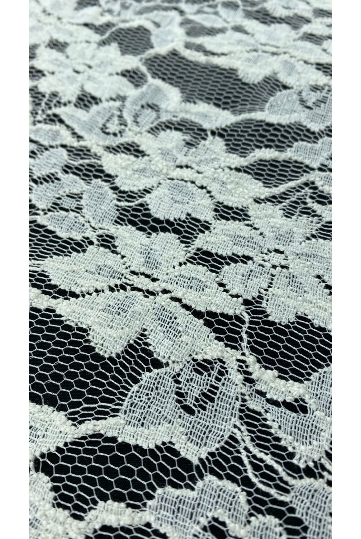 Pamuk ve naylon karışımlı fikse edilmiş ithal dantel, zarif tasarımları destekleyen şık bir seçimdir..